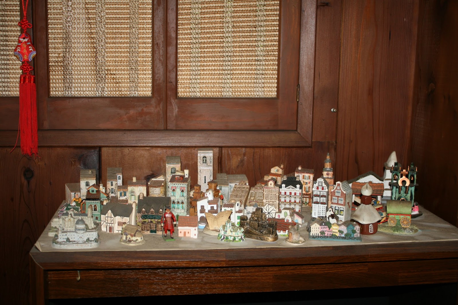 My mother's somewhat dusty and crowded global village; she collected houses and other buildings from various countries around the world. I kept a few of them.